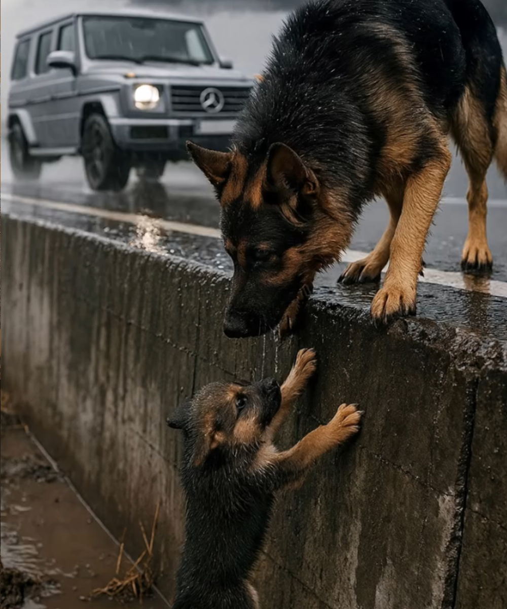 Carefully, I crouched down, reached over the slick edge, and scooped the little one into my arms. The pup trembled violently, its fur cold and heavy with rain. Slowly, I carried it up to the road, placing it gently beside its mother.