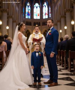 Every head turned. Standing at the front, clutching a phone in both hands, was eight-year-old Lucas Carter—the groom’s son. His eyes brimmed with tears, but his voice carried the weight of truth.