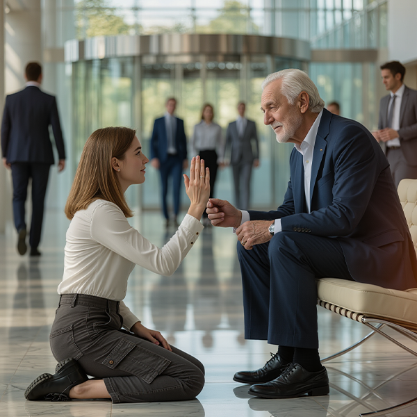 The lobby buzzed like a beehive—couriers, click-heels, espresso breath, the perfume of urgency. Catherine was collating pitch books when an elderly man in a navy suit stepped to the marble counter. He smiled, tried to speak, then lifted his hands and began to sign.