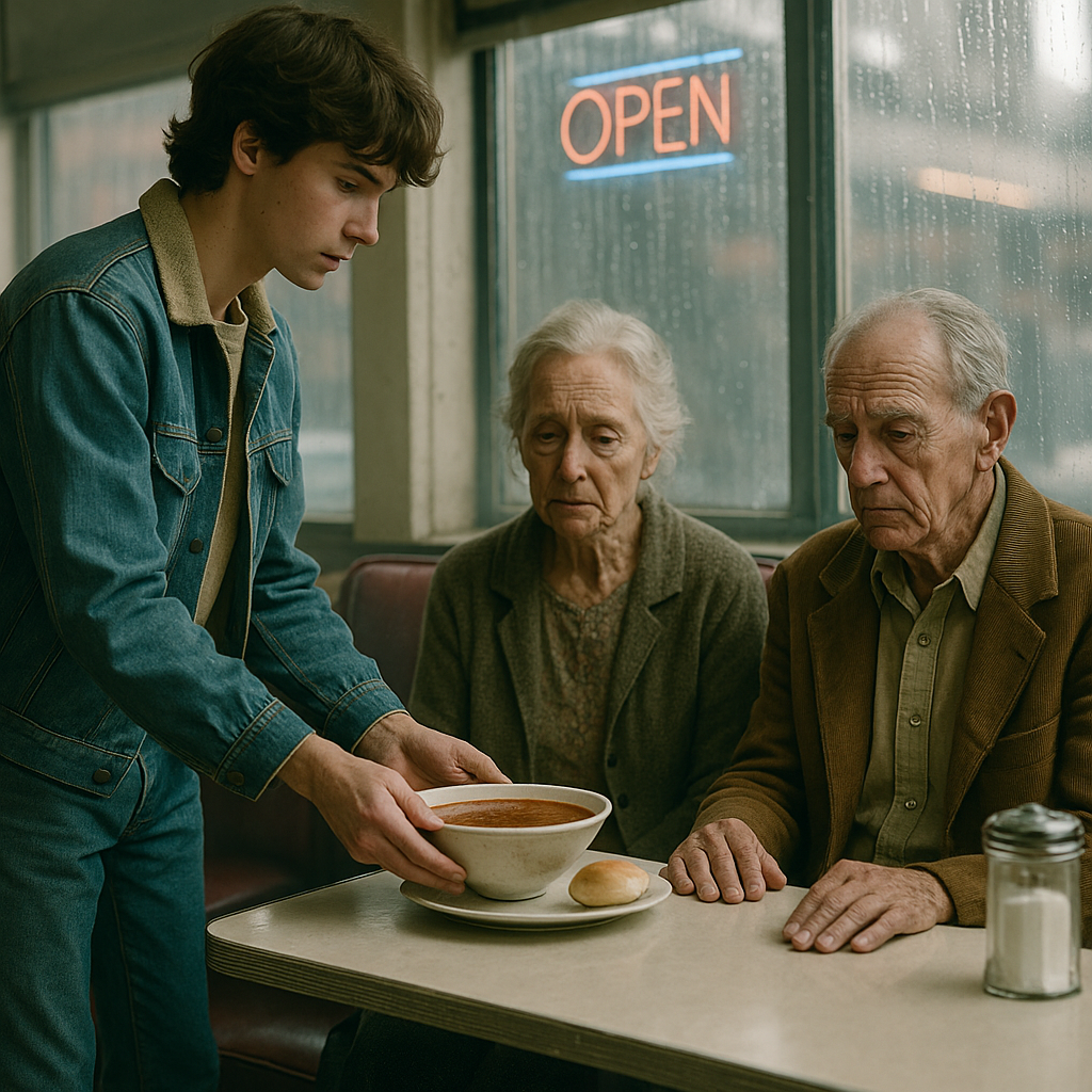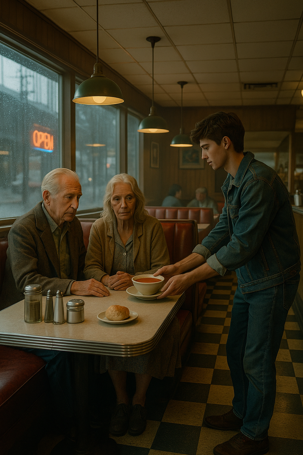 He ordered the smallest thing on the menu—a bowl of tomato soup and a roll—and waited while rain tapped softly against the diner windows.