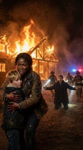 With Liam clinging to her neck, she fought back through the smoke, pushing beams aside with her bleeding hands, kicking through burning debris — refusing to stop, refusing to let fear win.